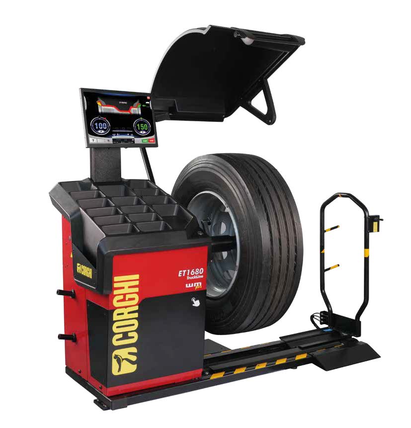 Motorisert avbalanseringsmaskin for lastebil med touchskjerm og pneumatisk hjulløfter. Automatisk innlegging av hjuldata. Oppspenning og konsett tilkommer.